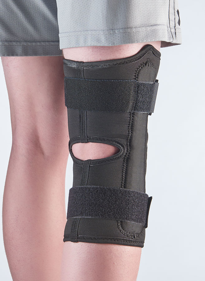 - Features movable u-shaped Cor-Trak buttress with textured finish for maximum patella stabilization and aluminum hinges for moderate medial/lateral support.