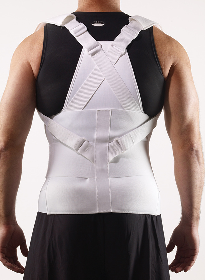 - Rigid posterior panel stabilizes from T9 to SC junction and can be adjusted with heat to achieve a custom fit; lateral panels help prevent side bending; hand loops and Power-Pull Closures allow patients with limited upper extremity strength and dexterity to independently apply the brace.