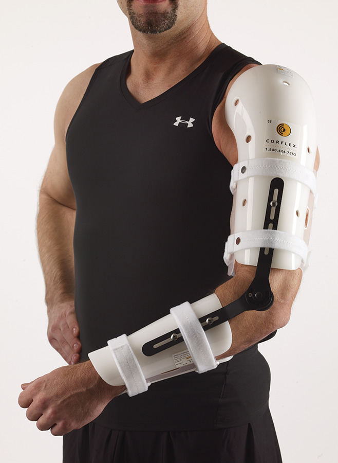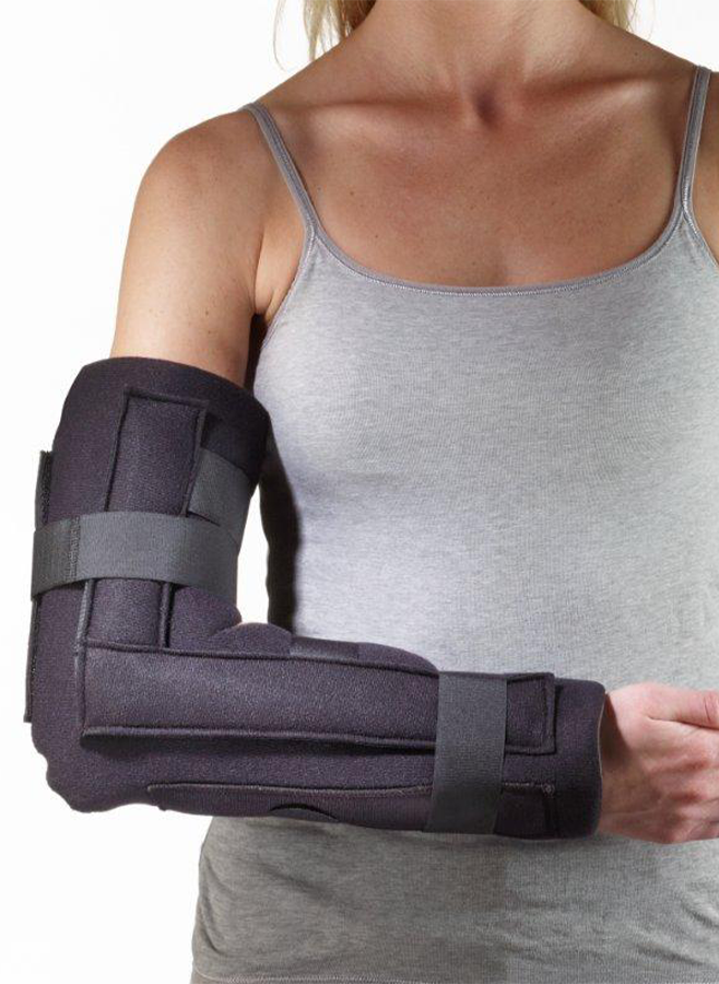 - Unique anterior design immobilizes and positions elbow at 122º while allowing easy access to dressings.